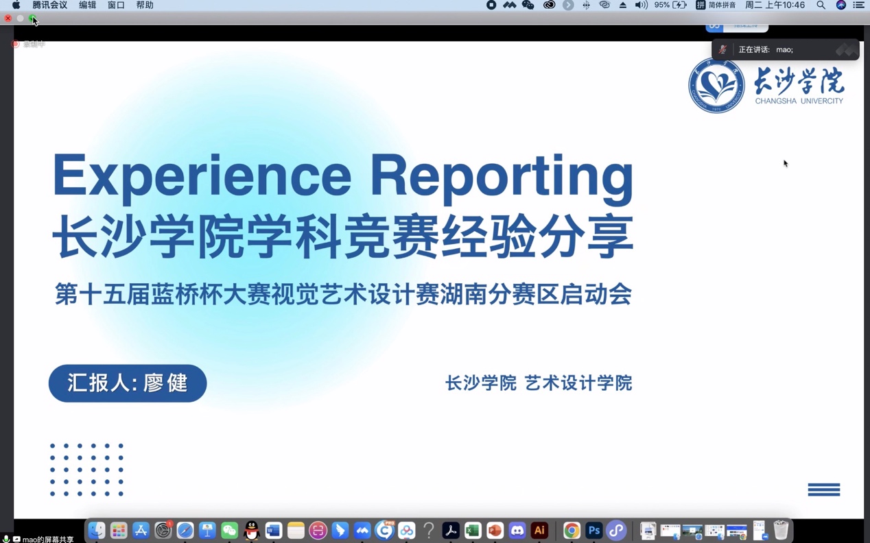 2024年1月9日,第十五届蓝桥杯大赛视觉艺术设计赛湖南分赛区启动会以线上形式成功举办,艺术设计学院廖健老师应组委会邀请,就学院及个人的教学改革经验及学科竞赛参赛经验进行了分享。