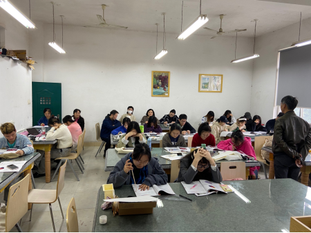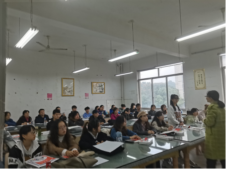 服装与服饰设计专业刘剑虹、易群燕老师在讲授课程,服装专业全体老师在集中听课。