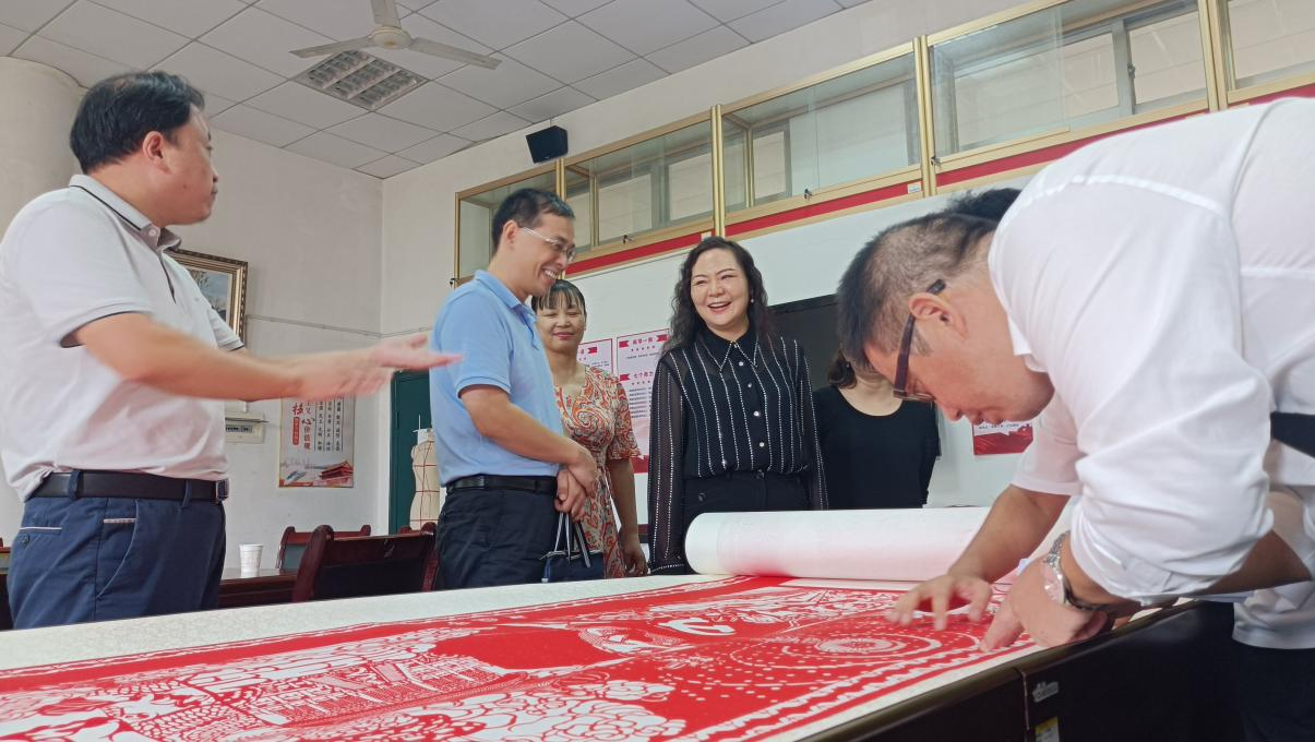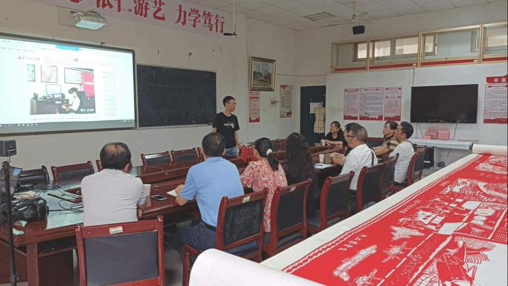 会上,我院副院长黄佳向彭昊副院长一行讲解了利用VR虚拟现实技术全景式、全方位呈现爱国教育示范基地的设计灵感和设计初衷。接着,我院科研助理王嘉鑫展示了百米党史剪纸长卷的重点篇章,并讲述了作品创作的过程及感受。