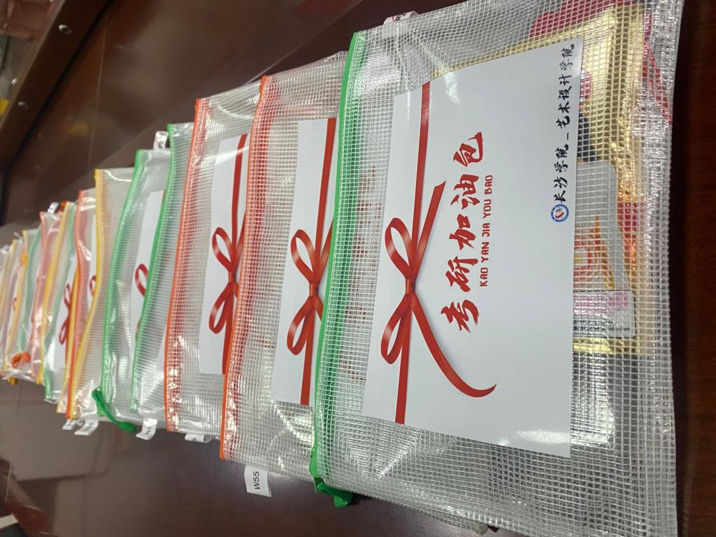 11月15日艺术设计学院为全院35名考研学子做考前动员并发放“考研加油包”,“考研加油包”里面有一张祝福卡片、一片暖宝宝以及一组专门的考试用笔,小小礼包传递力量和温暖。