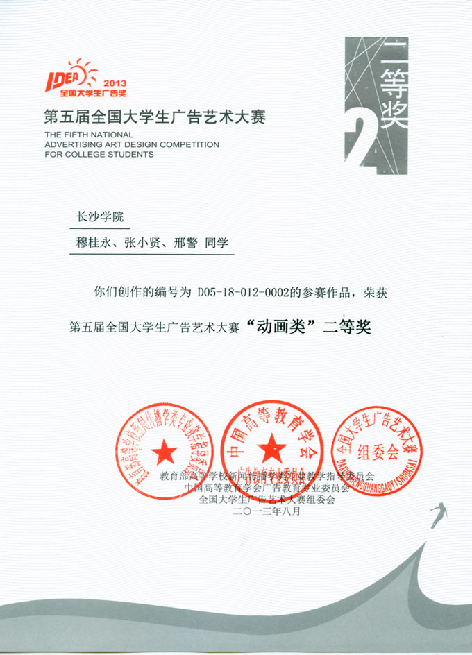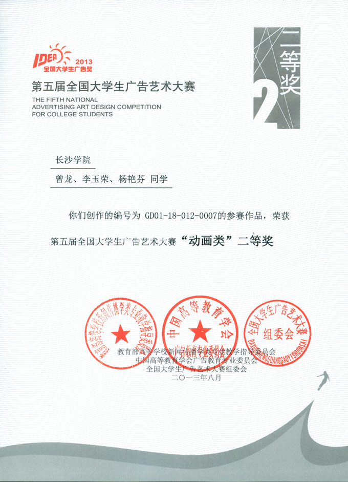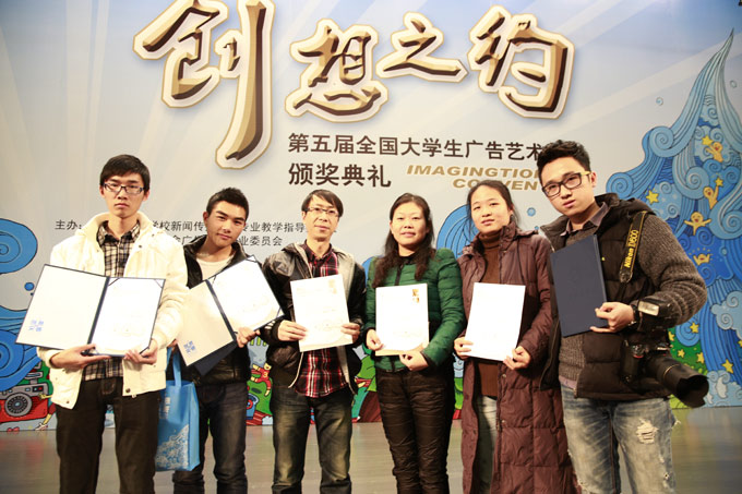 11月30日,由教育部主办的第五届全国大学生广告艺术大赛颁奖典礼在全国政协礼堂隆重举行,我校艺术系教师邓伍英、黄佳、周亚兰以及学生曾龙、穆桂勇、赵俊洪代表学校获奖师生参加了此次颁奖典礼。第五届全国大学生广告艺术大赛吸引了全国两千余所高校参加,共提交作品21万件。我校在此次大赛上获得优异成绩,共有7件动画类作品获全国奖。其中,我校获得动画类二等奖2项;三等奖2项,另还获得全国优秀奖3项。