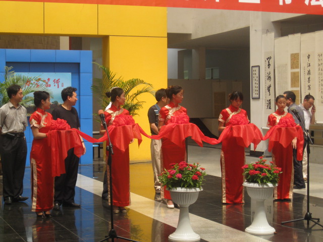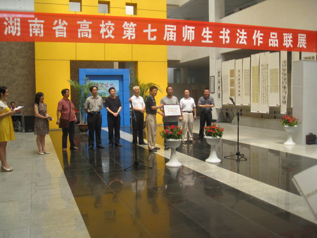 李云龙副书记致辞,他简要阐述了对书法文化的理解,将学习书法的历程总结为“书者乐文、法者乐古、篆者乐心、刻者乐巧”,并做了精炼的阐释,同时,对高校书协为此次联展做出的准备工作表示了衷心的感谢。书协艺术家蔡德林表示高校是书法发展的一个良好平台,此次书法联展将促进书法在高校的发展,丰富师生的文化生活,他还就书法在高校的发展给予了建议。高校书协主席王元建为我校授予了“湖南省高校第七届师生书法联展优秀组织奖”的奖章。王元建、蔡德林、王希俊、苏美华为此次联展剪彩。最后,艺术系党总支书记胡嫔宣布此次联展开幕。