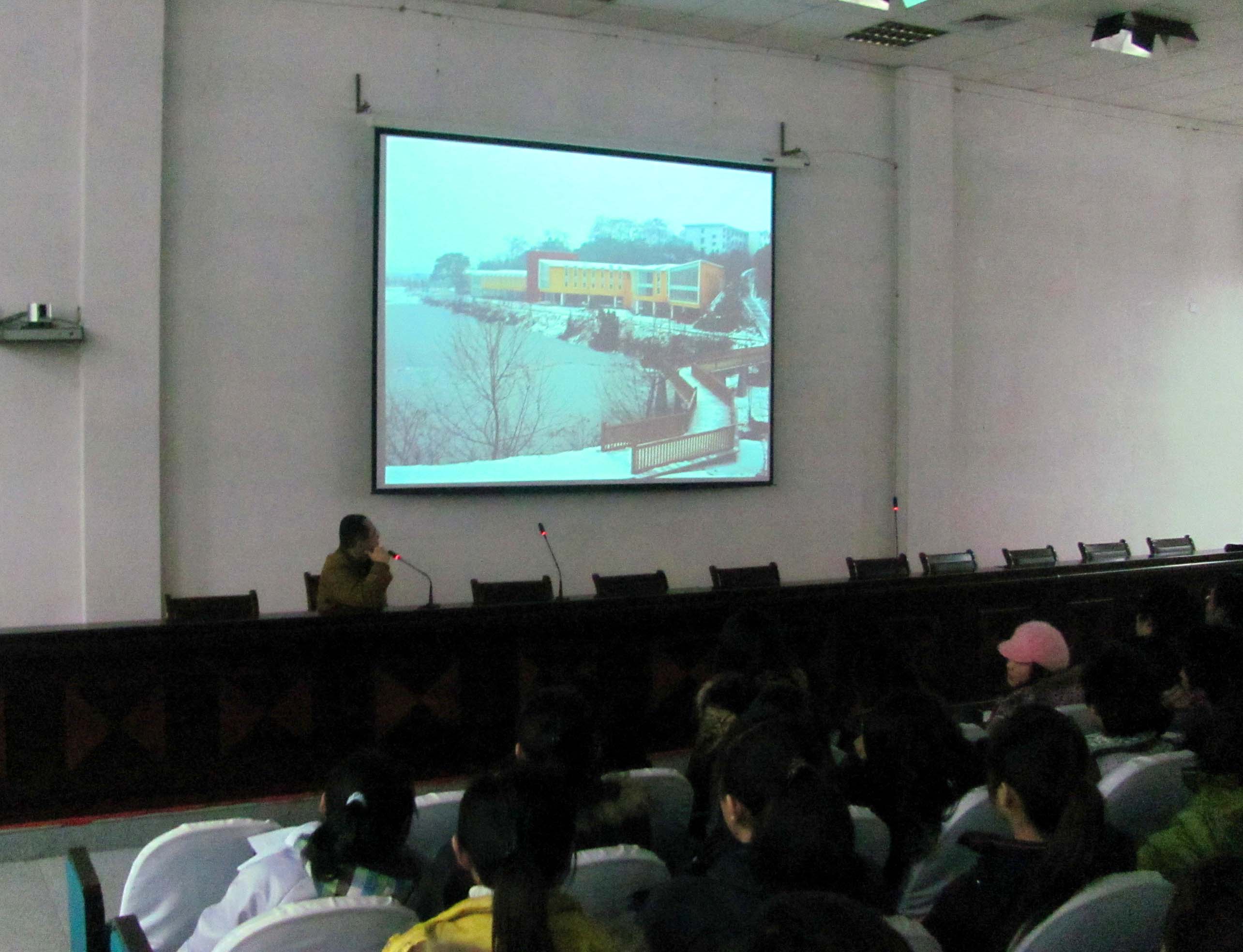刘院长首先展示了一组校园风光图片:绚丽的艺术楼、别具一格的音乐楼、挺拔的东来阁、银装素裹的体育场……把大家带进了一个美轮美奂的世界。刘院长绘声绘色地给大家描绘了校园的美丽后,又演示了一组同学们在校园内践踏草地、乱扔垃圾等不文明行为的图片,并从正反两个方面就为什么要重视校园环境这一问题进行了分析。他指出“我们不仅要看到校园的美丽,更要看到校园生活中存在的问题”,他希望通过此次讲座能引起同学们的反思,自觉爱护我的校园,不要让不良风气和陋习破坏了校园的美丽与生态的和谐。