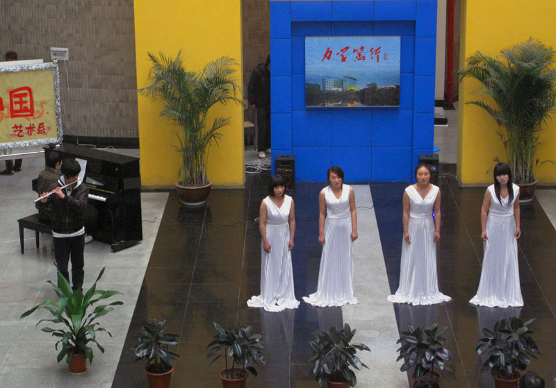开幕节目由音乐学专业师生献演。女生表演唱《木叶吹呀吹》和谐悦耳、欢快热烈;古筝独奏《渔舟唱晚》古曲悠远、余音绕梁;舞蹈《在水一方》且吟且舞、意犹未尽;小组唱《深深的海洋》优美抒情、清新淡雅。演出在青年教师熊琦的二胡独奏《吉普赛之歌》中掀起高潮,技艺娴熟的演奏,沉稳大气的台风赢得现场热烈的掌声。