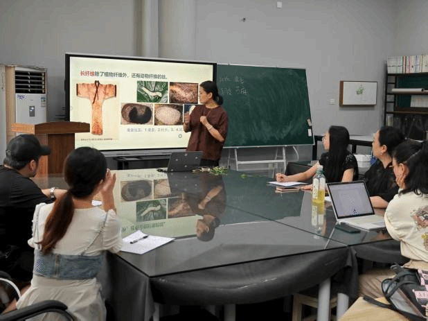 2. 服装教研室。周磊主任、刘晓萍、李霖霞等五位教师和一位大三学生,全程观摩了邱元彦老师讲授的《服装材料学》。邱元彦老师以提问学生着装面料的形式导入课程,从人类穿衣的历史及面料起源入手,逻辑清晰地阐述了面料发展史,还邀请学生分享了在课程学习中遇到的问题和学习感受。