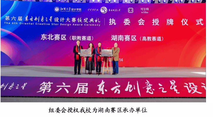 在活动中,我院艺术设计学院院长胡友慧教授受邀作为全国高校赛道代表发表主旨发言。她围绕“设计教育与创新实践融合”这一主题,分享了学院在人才培养与赛事推动方面的实践经验与深入思考。发言内容详实、视角独到,获得现场专家与同行的广泛好评。随后,经大赛组委会授牌,我院正式成为湖南赛区承办单位,这标志着学院在该赛事的组织与推广方面获得了重要认可。