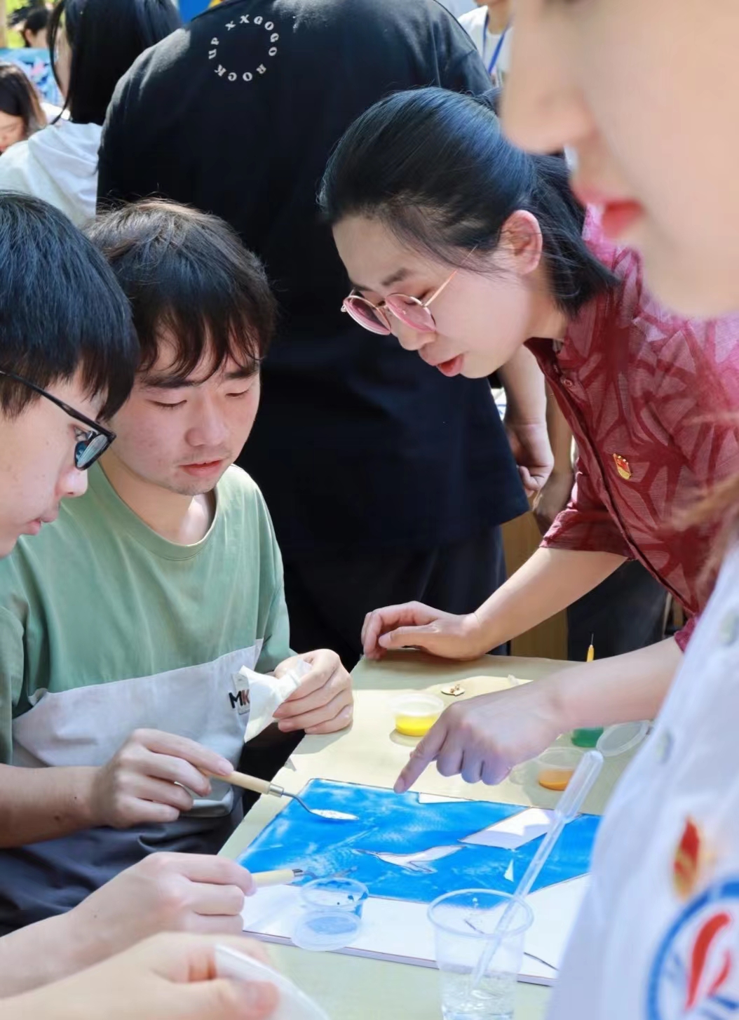 由共青团长沙学院委员会和艺术设计学院联合主办(CCSU空间团队、艺术·家成长辅导室共同承办)的“青春心向党,建功新时代”景泰蓝工艺画美育公开课于5月3日下午在勤思广场成功举办。长沙学院党委委员、副校长曾广胜,校团委副书记尹方园,艺术设计学院党总支书记舒欣、院长胡友慧、副院长邓伍英、副院长黄佳等领导莅临现场观摩指导。来自艺术设计学院20级视觉1班、2班全体同学和全校不同专业的100名团员参与了此次集体创作活动,共同完成了主题景泰蓝工艺画《青春心向党,建功新时代》的创作。