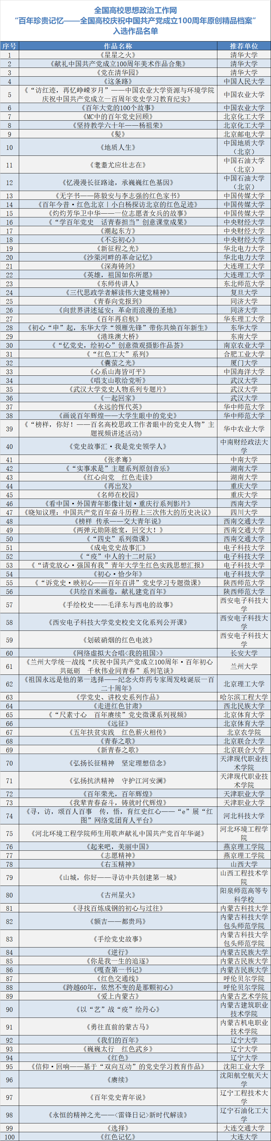 附件:全国高校思想政治工作网“百年珍贵记忆——全国高校庆祝中国共产党成立100周年原创精品档案”入选作品名单