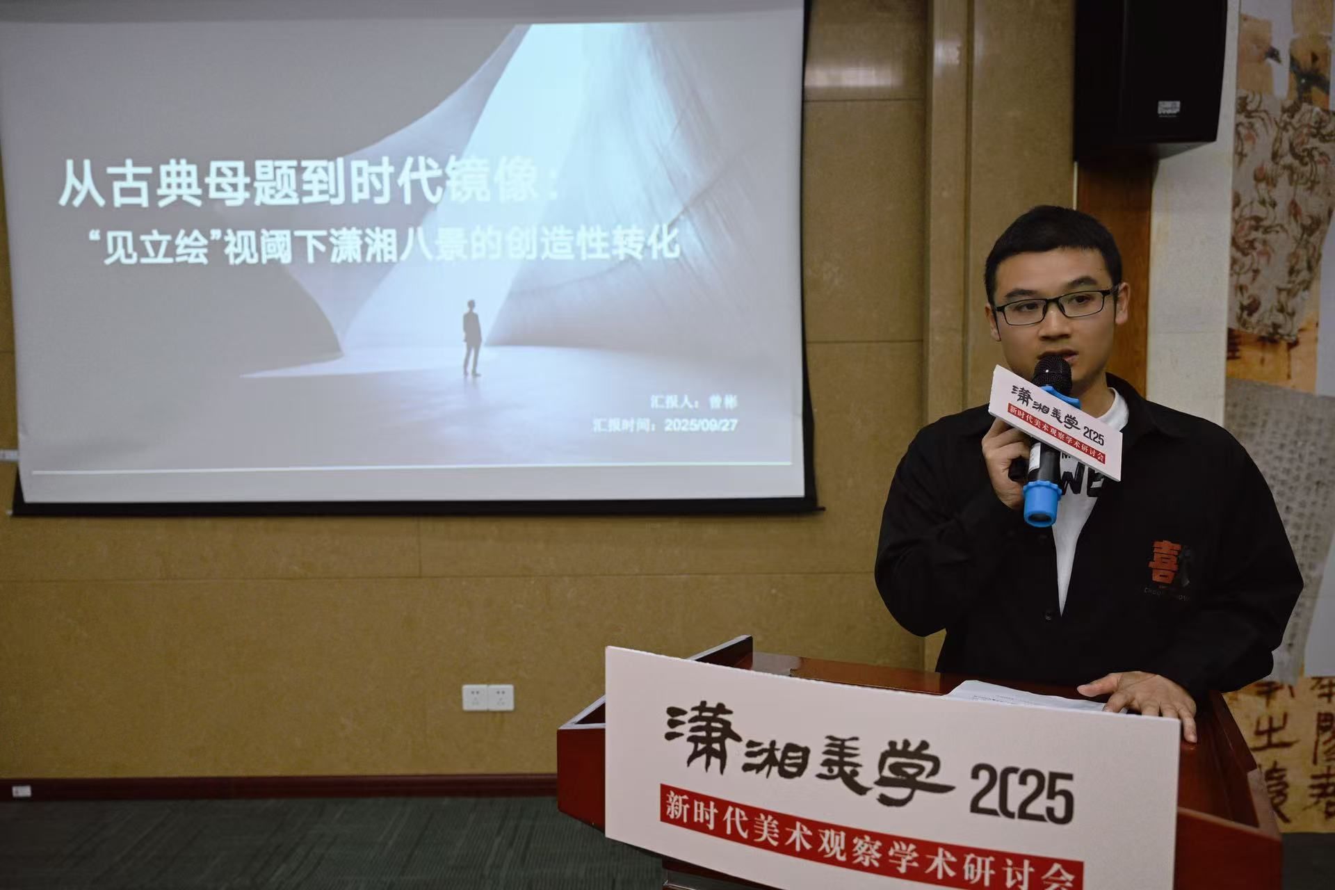 9月27日,由《美术》杂志社、湖南省美术家协会、湖南省文艺评论家协会、湖南省画院、长沙师范学院共同主办的“潇湘美学2025:新时代美术观察学术研讨会”在长沙举行。我院博士教师曾彬受邀参会,并作题为《从古典母题到时代镜像——“见立绘”视阈下潇湘八景的创造性转化》的学术报告。