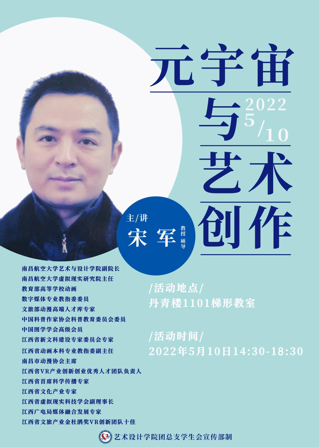 2022年5月10日下午,艺术设计学院邀请南昌航空大学艺术与设计学院宋军教授以《元宇宙与艺术创作》为题,在丹青楼1101梯形教室做学术讲座。本次讲座由艺术学院副院长邓伍英教授主持,学院师生共计80余人参加了本次学术交流活动。