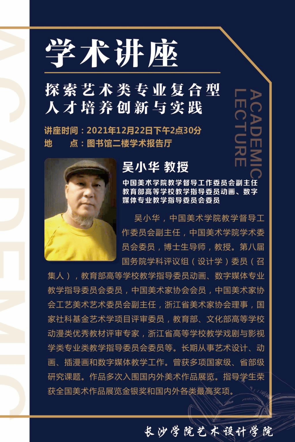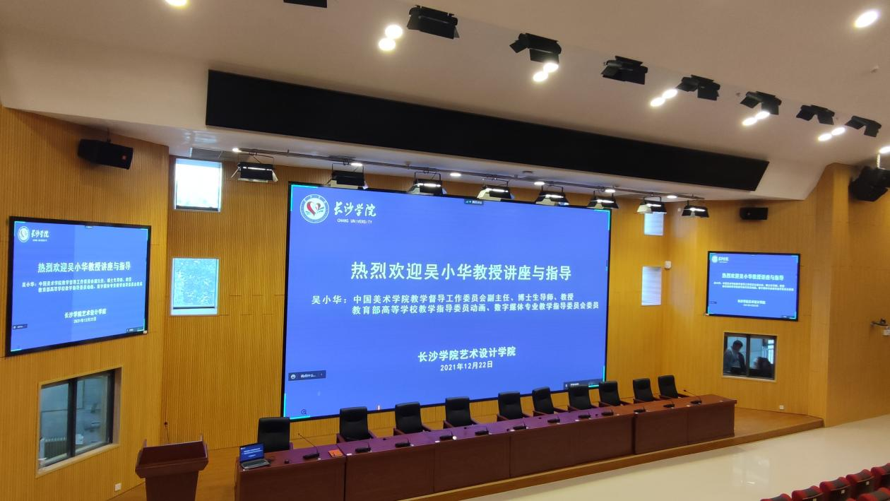 2021年12月22日下午,艺术设计学院邀请中国美术学院创新设计学院吴小华教授在长沙学院图书馆2楼学术报告厅以《探索艺术类专业复合型人才培养创新与实践》为题做学术讲座与专业指导。本次讲座由艺术学院副院长邓伍英教授主持,艺术设计学院党委书记舒欣、副院长黄佳、副书记黄慧瑾以及部分专业师生200余人参加了本次学术交流活动。
