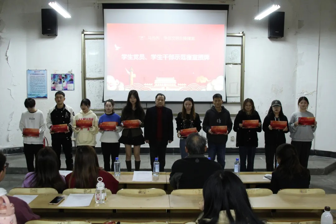 会议伊始,学生干部代表宣读了艺术设计学院寝室文明公约,通过一项项公约细则来引导同学们的日常行为。其次,学院党总支书记舒欣对学生党员、干部提出了要求,希望他们通过挂牌仪式创建模范寝室,充分发挥党员干部示范引领作用,在日常学习和生活中严格要求自己,主动帮助他人,以榜样的力量带动周围的同学。接着,老师们分别给学生党员干部寝室成员进行授牌并合影留念。最后,由学生党员干部代表朱禹璇带领全体学生党员干部进行庄重宣誓。