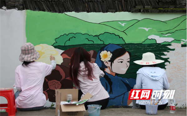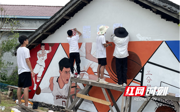 墙绘队大学生正在绘制“辰溪人爱篮球”主题文化墙