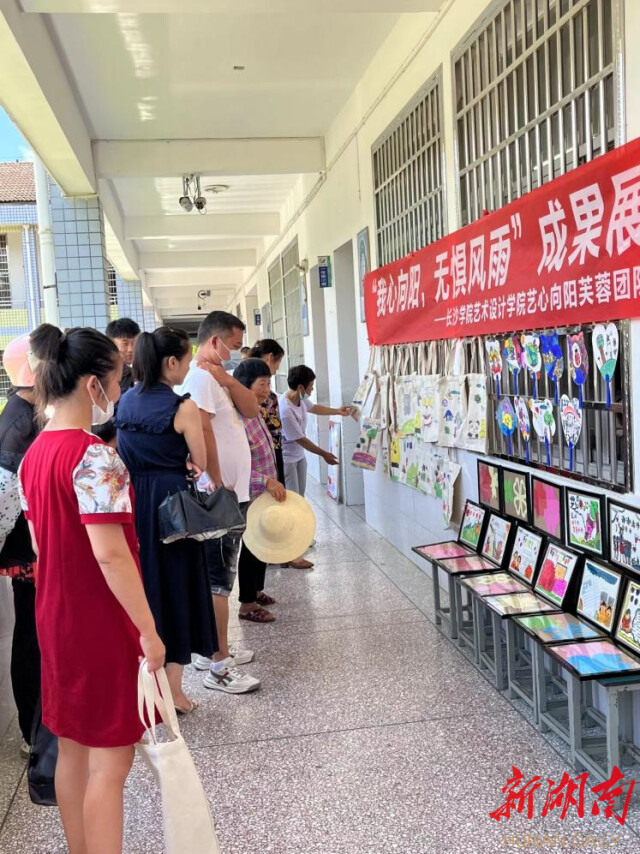 活动结束之后,“艺心向阳·芙蓉学子”团队联合新铺镇育红完全小学开展了“我心向阳,无惧风雨”主题成果展,展览展出以“真”“善”“美”“爱”为主题的画作,吸引大量老师以及学生家长驻足观看。此次活动,得到了中河铺村教育基金会的大力支持。
