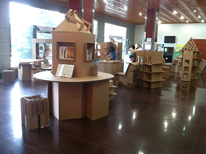 艺术设计系朱希平老师和2013级环艺一、二班的同学们物尽其用。废弃的硬纸板,在致力于可持续性发展和绿色设计的2013级环艺一、二班同学们手中,变成了一件件可以再利用的艺术品。他们还积极发动广大师生把自己看过的、有意义的闲置书籍拿出来,待活动结束时凭还书卡自由换取别人的书,实现资源共享,知识增值。