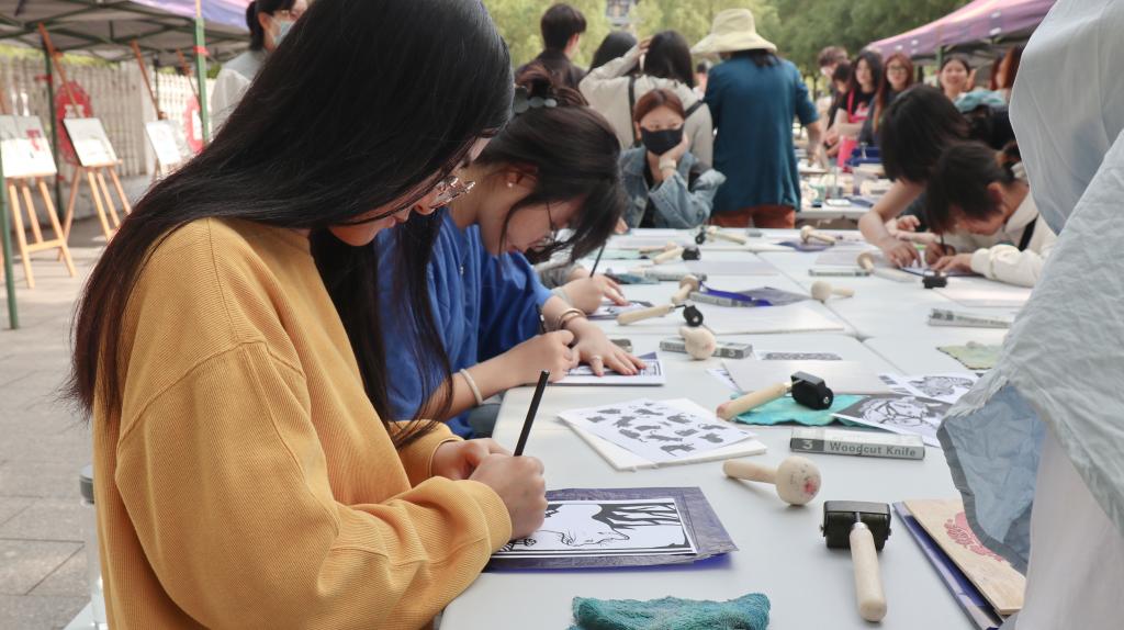 周建老师及秦娅娜老师现场展示了版画和丝网印刷的简易制作过程。艺术设计学院40余名同学担任“小老师”,协助指导来自全校各个学院的同学一起学习、体验传统非遗工艺的制作。