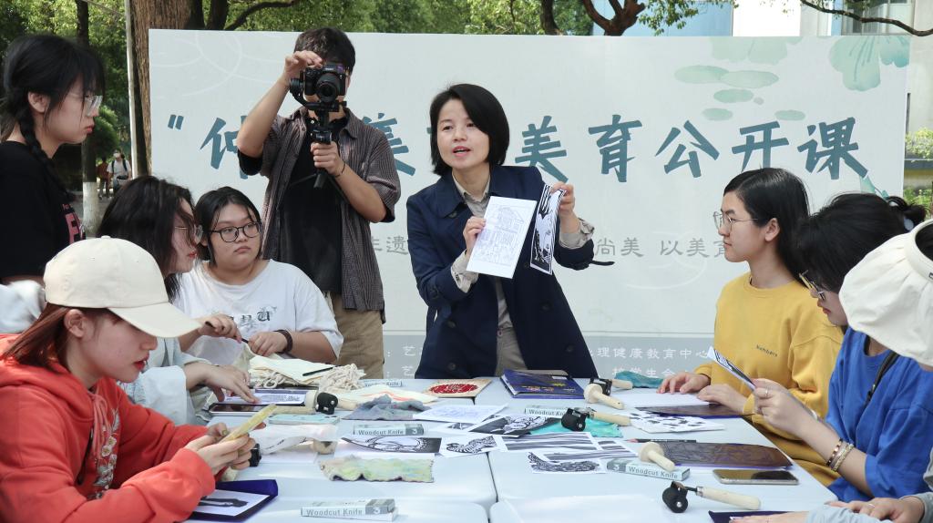 艺术设计学院院长胡友慧介绍了开设这堂美育公开课的初衷,“以美育人”教育理念是以艺术体验的方式让更多的青年学子感受中华优秀传统文化的生命力,了解和体会版画、丝网印刷的艺术魅力,在沉浸创作的同时舒缓学习和生活的压力,实现“艺术疗愈”。