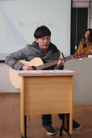 整个活动现场气氛十分轻松、愉悦,大家都陶醉在悠扬的音乐中,有轻声和的、有挥手回应的、有默默倾听的,正是这样轻松、愉悦的氛围,参与演出的同学也是完全感觉不到压力的存在。来自13级环艺四班的刘亚飞同学被现场气氛所感染,自愿上台表演了一首歌曲。