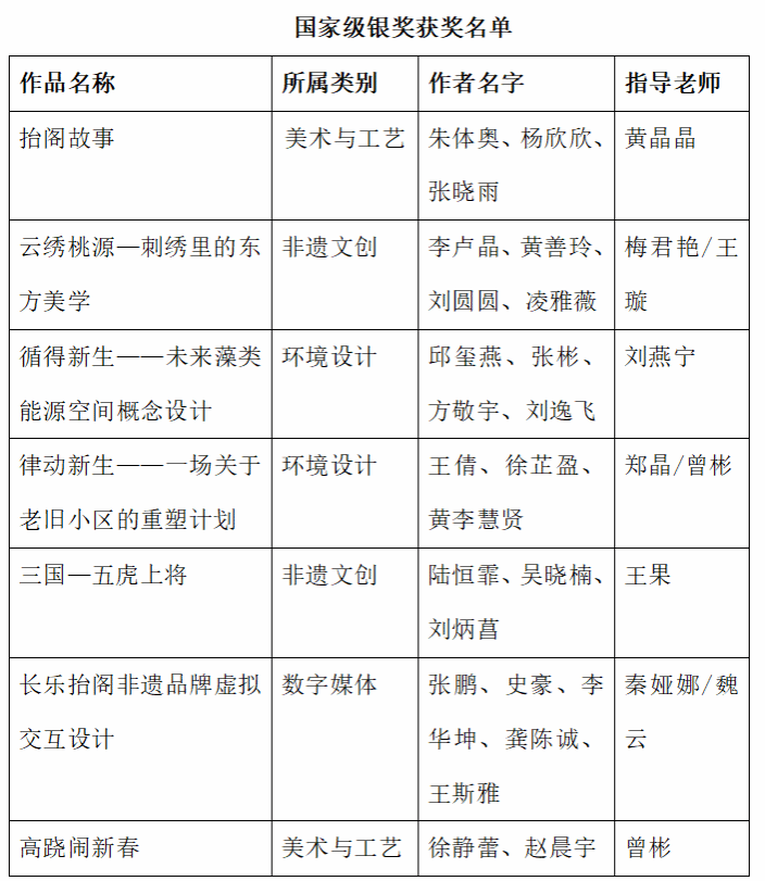 赛事采用“校赛、省赛、国赛”三级选拔机制,竞争激烈,具有广泛影响力。在本届比赛中,艺术设计学院共获得91项省级及以上级别奖项,共获国家级银奖8项、铜奖11项、省级金奖10项、银奖29项和铜奖52项。其中,《云绣桃源——刺绣里的东方美学》《循得新生——未来藻类能源空间概念设计》《三国——五虎上将》《抬阁故事》《律动新生——一场关于老旧小区的重塑计划》《长乐抬阁非遗品牌虚拟交互设计》《高跷闹新春》《墟境元生》八组作品,凭借出色的创意设计和深厚的文化底蕴,最终荣获国家级银奖。